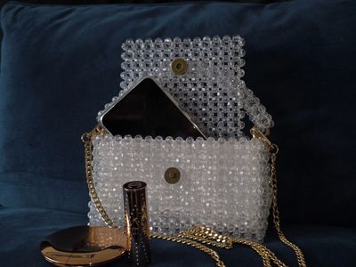 Each bag is meticulously made by Maya by hand over 18 hours, featuring premium lightweight acrylic beads intricately woven to create a silhouette inspired by modern British couture design.